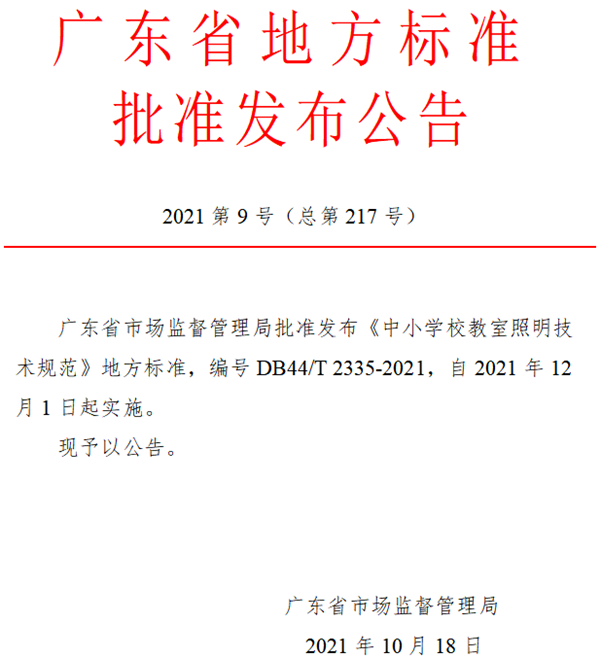 《廣東省地方標準<中小學校教室照明技術(shù)規(guī)范>》于2021年12月1日起正式實施。該標準適用于新建、擴建、改建和實施照明改造的中小學校教室,包括普通教室、實驗室、閱覽室、舞蹈教室、美術(shù)教室、書法教室、計算機教室、記憶電子閱覽室等教室場所。2023年底,確保完成學校教室照明100%符合國家標準要求,廣東省將全面完成中小學校教室照明達標任務(wù)。