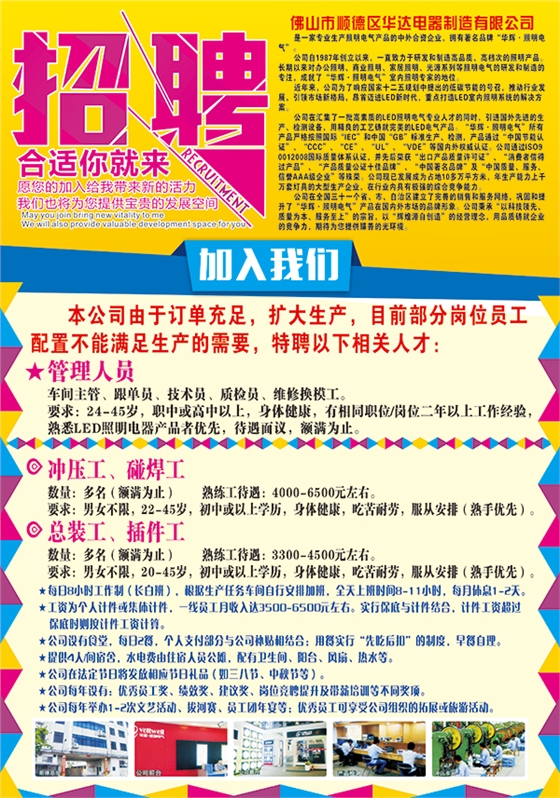 佛山市順德區(qū)華達(dá)電器制造有限公司是一家專業(yè)生產(chǎn)室內(nèi)LED照明燈具產(chǎn)品的大型企業(yè),成立于1987年,擁有品牌“華輝•照明電氣”。本公司主要生產(chǎn)LED面板燈、格柵燈盤、燈管支架、LED筒燈、LED射燈等等?,F(xiàn)由于擴(kuò)大生產(chǎn),訂單充足,目前部分崗位員工配置不能滿足生產(chǎn)的需要,特聘以下相關(guān)人才:管理人員、沖壓工、碰焊工、總裝工、插件工等。